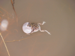 How long can the metamorphosis from tadpole to frog take? I have a tadpole in a bucket that I have been feeding since the end of the last wet season! He has grown a bit larger and paler but no appendages. - view